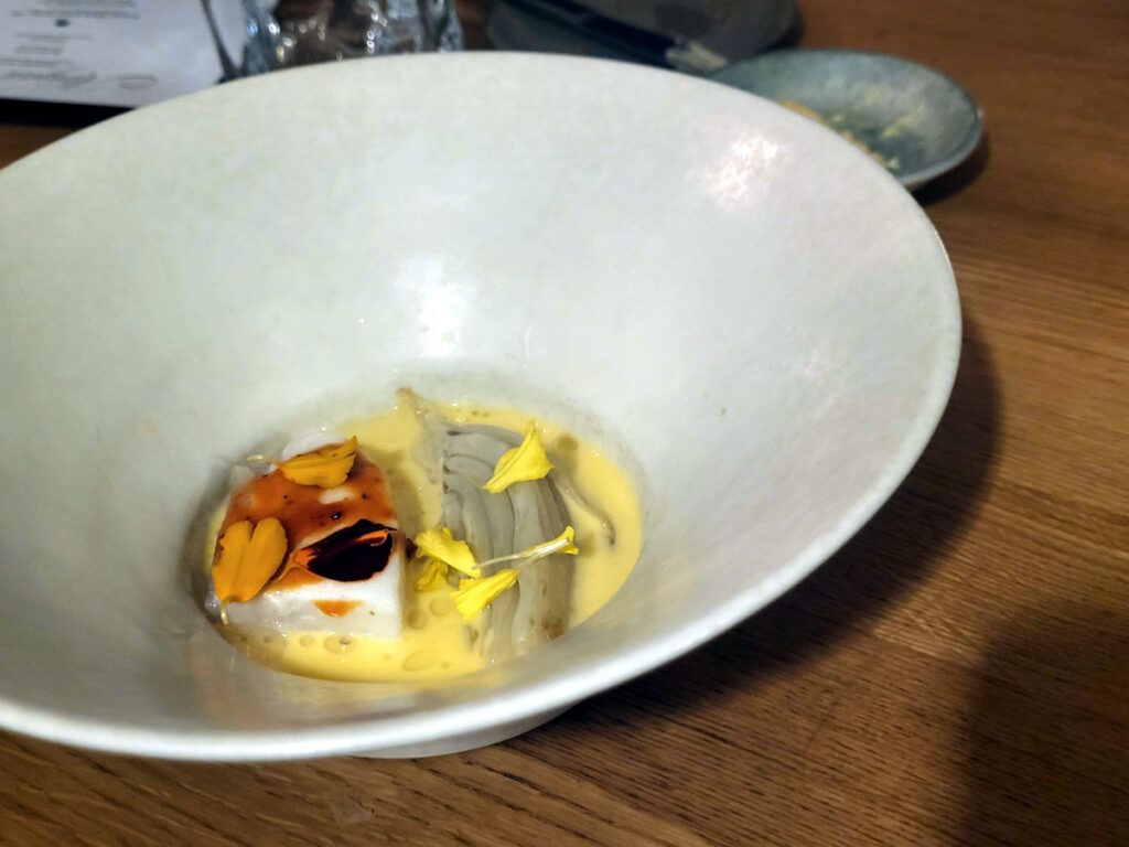 Den følgende ret havde næsten samme farvesammensætning men et noget andet indhold. Her lå et stykke helleflynder sammen med et stykke fennikel i en sauce lavet på blandt andet yuzu-kosho og shio-koji – to ingredienser jeg ikke selv har prøvet at arbejde med og kun er stødt på en eller to gange før. Igen-igen en fint afstemt ret, hvor den meget milde fisk ikke ‘druknede’ i smag fra saucen men stadig kunne fornemmes, når man kombinerede elementerne.