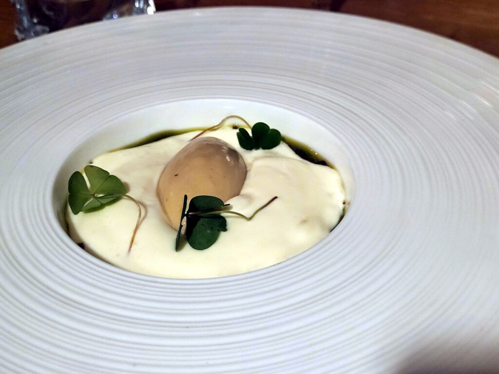 Nu gik vi fra de helt store skåle og til de små. Den næste servering bestod nemlig af små stykker blæksprutte i en muslingesauce med blandt andet miso og koriander. Jeg er stødt på denne type ret (fisk eller skaldyr i muslingesauce/skaldyrsskum) flere gange de senere år, og jeg synes, at det er en meget fin måde at lave en simpel og elegant fiske-/skaldyrsservering, som er let at anrette.