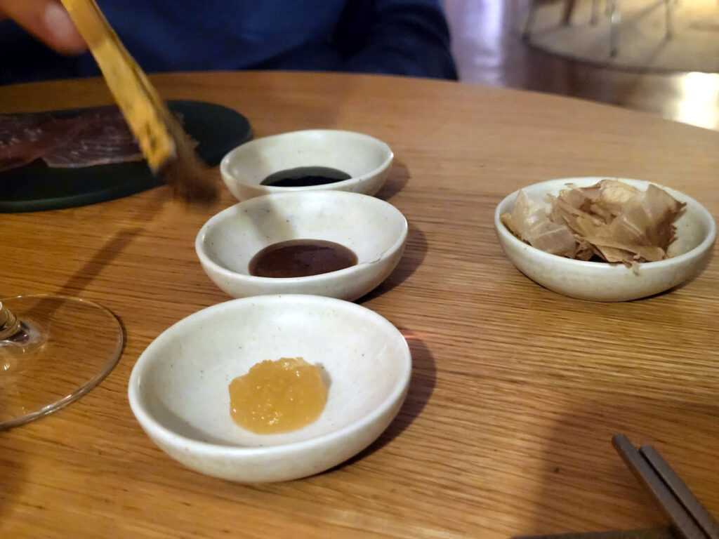… som man smurte med en lille pensel fra paletten af saucer. Udvalget bestod af sesamsauce, ingefærsauce samt hoisinsauce, og så kunne man drysse bonitoflager over. En meget sjov gimmick men også noget lettere at styre hvor stærk og krydret, man ønskede serveringen.