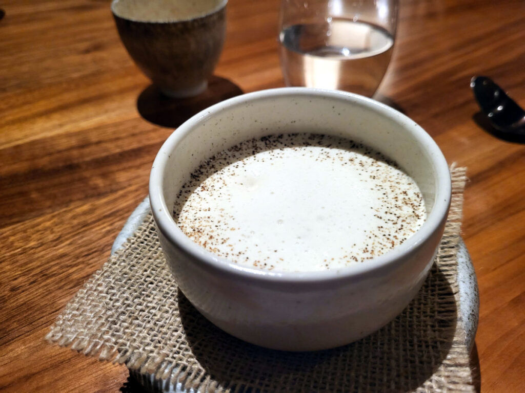 Nu fik vi en lille skål, hvor rettens overflade bestod af skum lavet på fermenteret ris. Nedenunder var der aubergine. Cremen havde en fantastisk konsistens, så den nærmest aede tungen. Meget spændende ret.