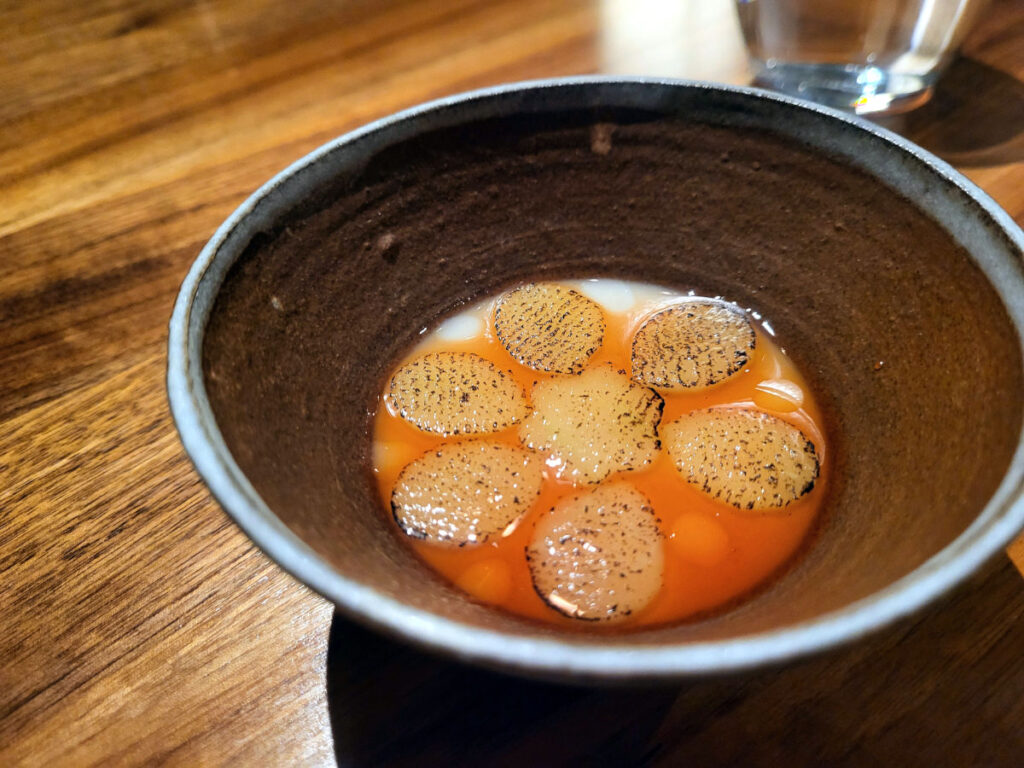 Denne fine glaserede bolle var lavet på tang og svampe og glaseret på en sauce lavet på grøntsagsrester. Den var toppet med en form for vegansk kaviar. Igen en ret mild men lækker servering, som føltes lidt syndig på grund af den glaserede overflade.