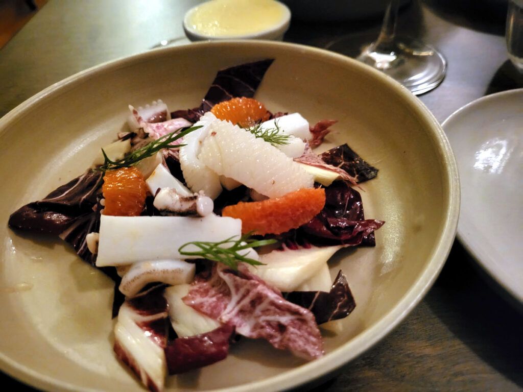 Dernæst kom den ret, som jeg desværre syntes var aftenens dårligste. Grillede blækspruttestykker kombineret med radicchio og appelsin. Salatbladene var for bitre og trængte til at blive stegt eller grillet, så de ikke fuldstændig overdøvede blæksprutten, og appelsinen virkede lidt malplaceret.