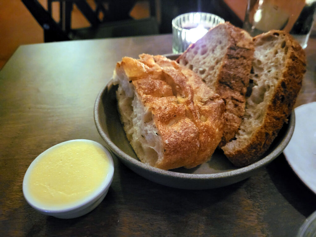 Kuvertbrødet bestod af et par skiver saftigt foccaciabrød samt et par skiver surdejsbrød. Naturligvis med smør til.