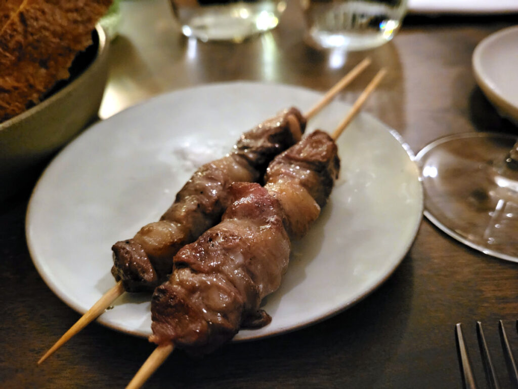 Der kom også et par retter på bordet. Først et par grillede lammespyd til deling. Saftige, velsmagende og enkle.