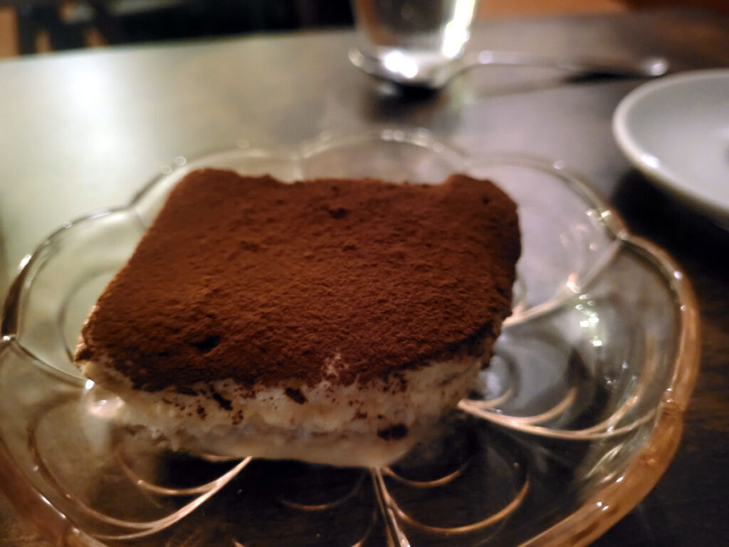 Desserten var et mediumstort stykke klassisk tiramisu til deling. Og her savnede jeg desværre lidt mere smag og sødme, ikke mindst fordi kaffen, der var brugt til desserten, var lidt for sur til min smag. Samme udfordring gik igen i den Espresso Martini, jeg i sidste øjeblik valgte at nyde til desserten. En lidt for sur og uinteressant udgave, som jeg helst ville have været foruden.