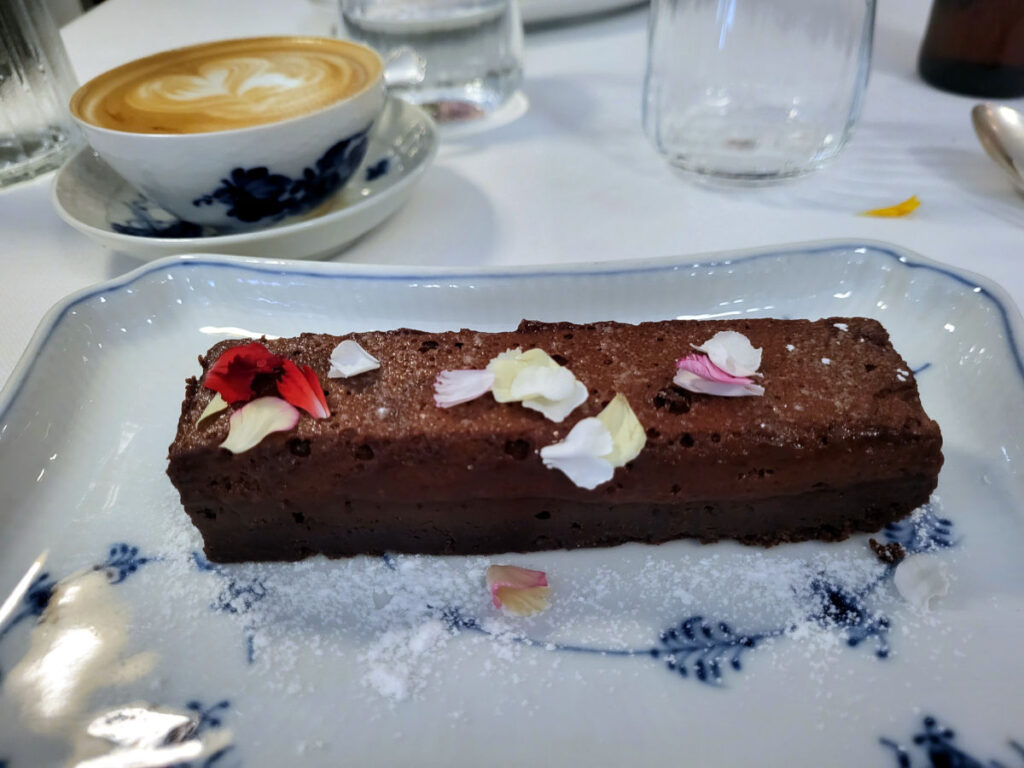 Vi var rimelig mætte på dette tidspunkt men besluttede, at vi også gerne ville prøve noget fra desssertkortet. Så måtte vi jo bare droppe at få eftermiddagskaffe senere på dagen. Jeg snuppede en cappuccino samt et stykke Gateau Marcel. Jeg fik dog serveret stykke, der var mindst dobbelt så stort, som jeg havde forventet, så jeg blev temmelig mæt! Men den havde en meget fin konsistens og en god balance mellem sødme og bitterhed.