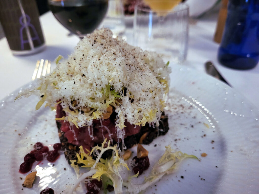 Mit andet stykke smørrebrød var denne højbelagte tatarmad med pebermayonnaise, sprøde hasselnødder, syltede tyttebær og gavmilde mængder af salatblade og revet Comté. Den smagte fremragende, hvor kødet var skåret helt perfekt, og hvor salatblade og ost gav lidt frisk syrlighed sammen med fedmen fra mayoen.