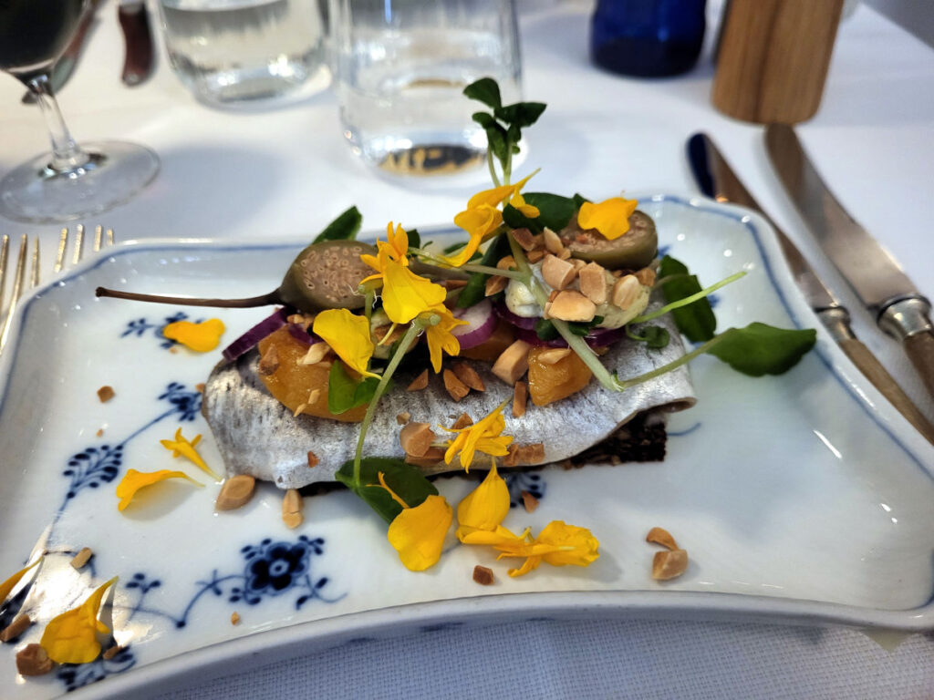 Der var mange spændende valgmuligheder, men jeg kunne selvfølgelig ikke stå for beskrivelsen ‘orangesild med abrikoskompot, pebermayonnaise og sprøde mandler’. Og så var der godt med spiselige blomster og store kapers på. En virkelig smuk servering, som havde en frisk og lidt sødmefuld smag fra appelsin og abrikoser uden at det kom til at smage for frugtet. Og dejligt med de sprøde mandler til at supplere rugbrødet. Meget fin silde-fortolkning!