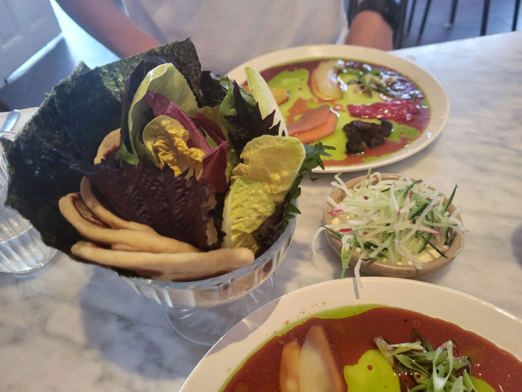 … der blev serveret med en lille skål med en creme toppet radise og peberrod samt en skål med salatblade og fladbrød. Tanken var så, at man lavede sine egne ‘håndmadder’ med salat eller brød som base og så toppet med melon og/eller svampe samt creme.
