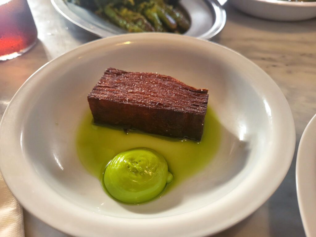 Der kom lidt brød og pisket, brunet smør på bordet, og så var det tid til næste ret. Her fik jeg kammusling skåret i skiver og lagt i nordisk dashi med tang og glaskål. En mild ret, der var godt afstemt, så ingredienserne ikke overdøvede hinanden.